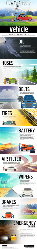 Before embarking on any road trip, you need to prepare your vehicle for the mileage and ensure the maintenance is up to date. Having the oil changed is vital because having new oil provides added engine protection for the trip, especially for prolonged intervals and long days of driving. Checking the tire pressure levels is crucial because it not only affects how the vehicle will ride, but correct tire pressure can be insurance against tire problems. Having clean air filters is essential because it improves engine efficiency by ensuring clean air to the engine. Keeping a stocked emergency car kit with first aid items and maintenance supplies is vital in case they are needed. Research how to prepare a vehicle for a road trip so your road trip will be as stress-free and safe as possible.