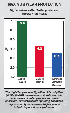 Like the rest of the V-Twin line, 15W-60 Synthetic V-Twin Motorcycle Oil is designed to resist extreme heat and deliver excellent wear protection. Summer riding can cause engine temperatures to skyrocket, especially in slow-moving rally or parade traffic, which places added stress on the oil and invites chemical breakdown and wear. AMSOIL 15W-60 Synthetic V-Twin Motorcycle Oil’s outstanding heat resistance helps bikers ride with confidence in the most extreme conditions.