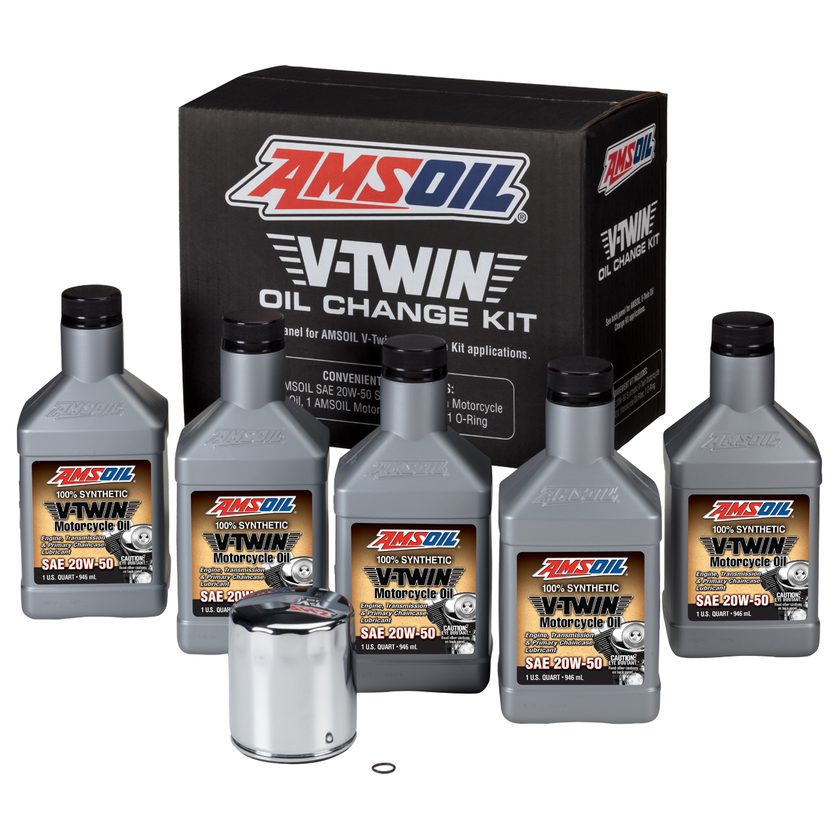 • Includes five quarts of AMSOIL 20W-50 Synthetic V-Twin Motorcycle Oil, one chrome AMSOIL Motorcycle Oil Filter and one drain-plug O-Ring