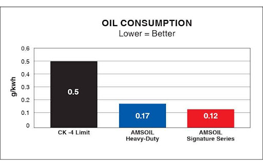 AMSOIL Signature Series Max-Duty has a low rate of volatility (burn-off), reducing oil consumption during operation and passing less oil vapor into the combustion chamber. It provides up to 76 percent less oil consumption than required by the API CK-4 standard in the Caterpillar-1N oil consumption test.